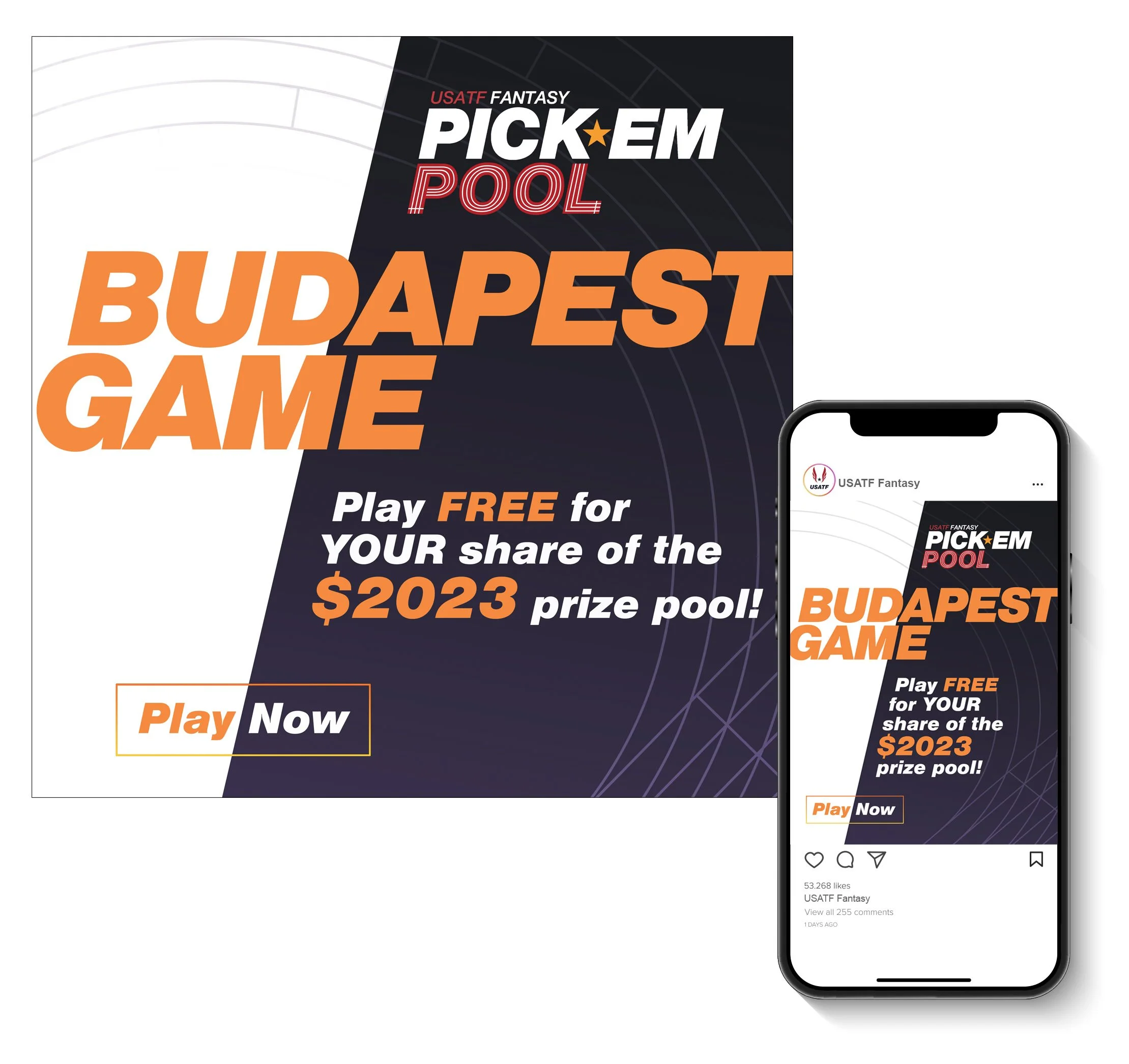 USATF Fantasy Pick’em PoolFull set of social media ads supporting USA Track and Field’s online Fantasy Pick’em Pool. Graphics reference track events while colorscheme corresponds to the Budapest Hungary event site.